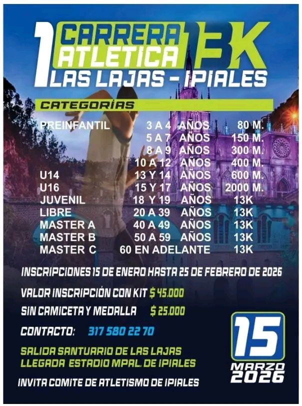 La historia y la pasión por el atletismo se unen en un recorrido épico e inolvidable: desde el majestuoso Santuario de Las Lajas hasta el Estadio Municipal de Ipiales.